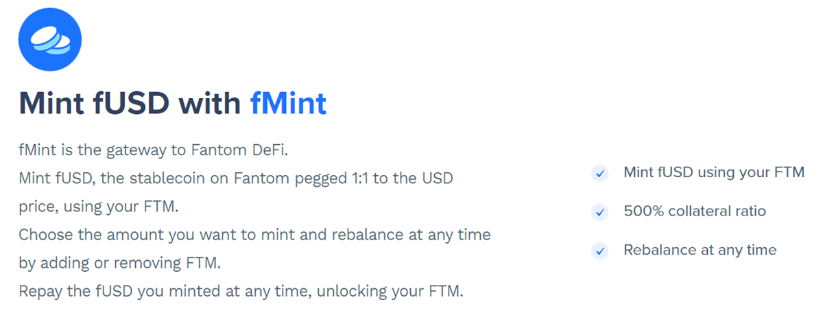 In order to secure the fantom network, $FTM is staked using the Fantom foundation website. These staked $FTM can be used to mint $sFTM that are used as collateral in order to mint the fantom native “stable” $FUSD. According to the Fantom Foundation website, you can mint FUSD at a 1:1 ratio to the USD price.