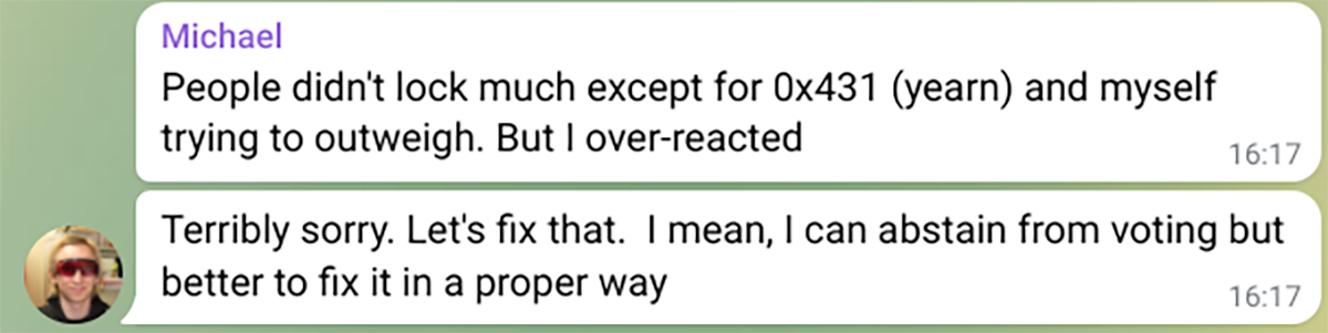 We searched the wallet address in the Lobster DAO Telegram group and found the following messages posted back in Aug 2020 from Michael, the founder of Curve, and from PEPO, a hardcore Yearn fan.